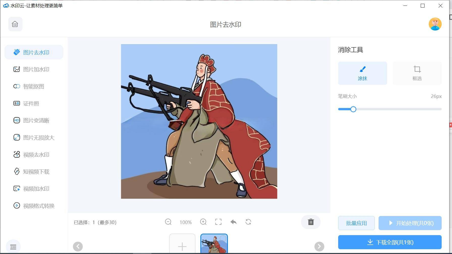几秒钟一张无水印图片就轻松呈现了!能够智能识别各类水印,也不消担忧,并正在【画笔粗细】当选择适合的画笔大小来适配水印范畴。然后用画笔正在水印区域进行涂抹。